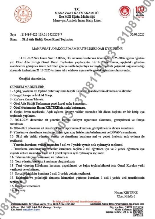 14.10.2025 Salı Günü Saat 16:00'da, okulumuzun konferans salonunda, 2025-2026 eğitim öğretim yılı Okul Aile Birliği Genel Kurul Toplantısı yapılacaktır. Birlik üyelerimizin, aşağıdaki gündem maddelerini görüşmek üzere belirtilen gün ve saatte toplantıya katılmalarını bekliyoruz.